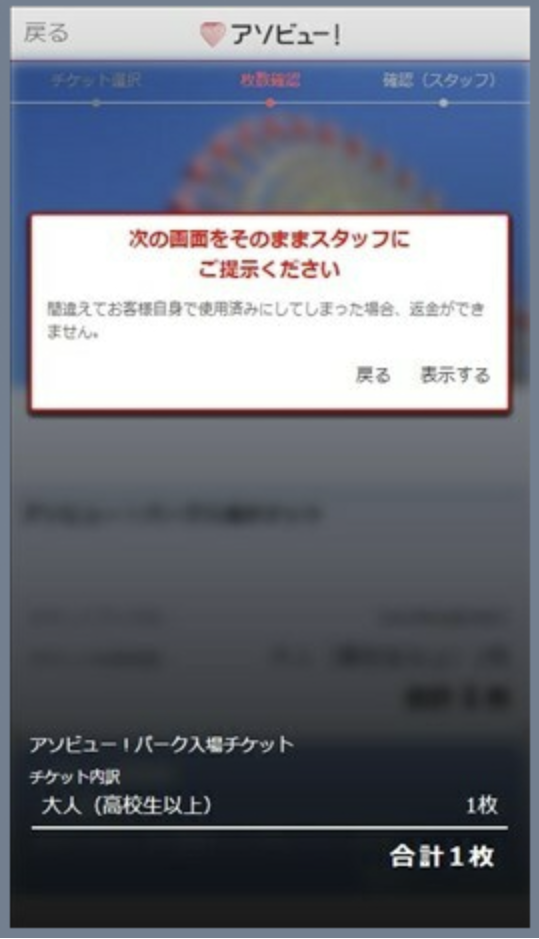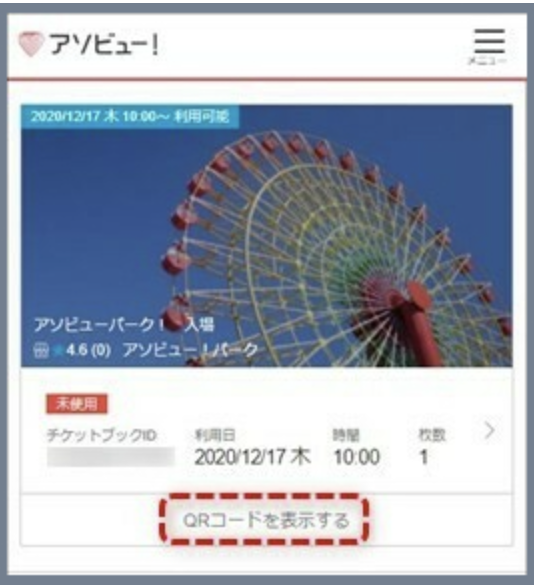 ※チケット画面に 「このチケットは、20**/**/** より使用できます。」 と表示される場合は、誤使用防止のため当日までチケットが表示されない設定となっています。予約当日になりましたら、購入完了メールのリンク、またはマイページより再度チケット画面へアクセスしてください。