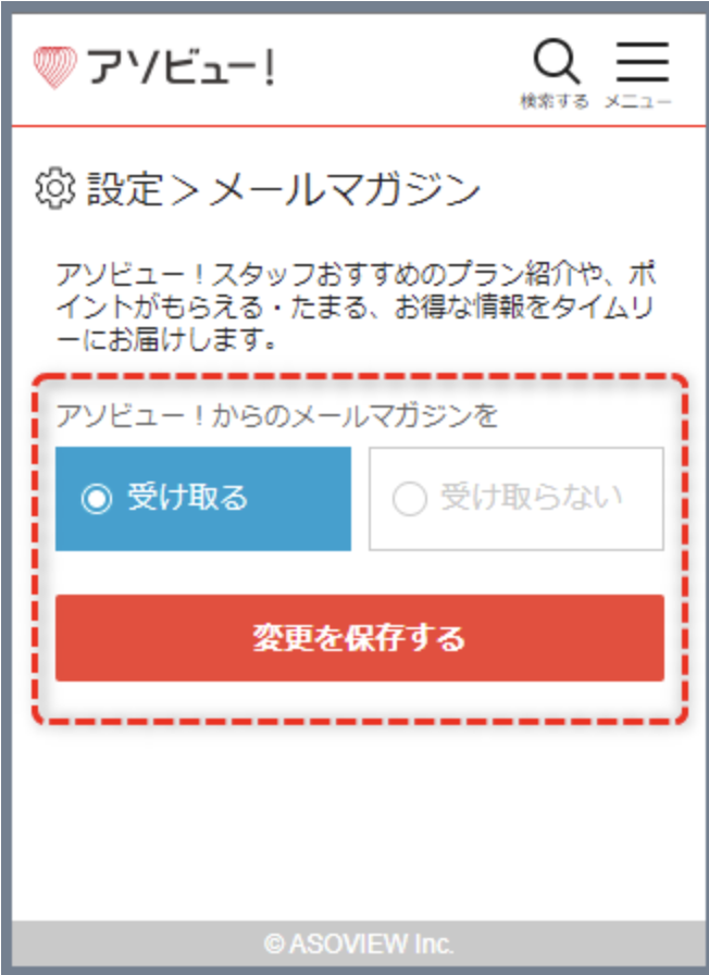メールマガジン下方にございます「配信停止」、またはマイページ内の設定にございます「メールマガジン」から変更が可能です。