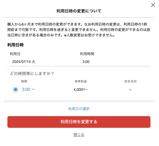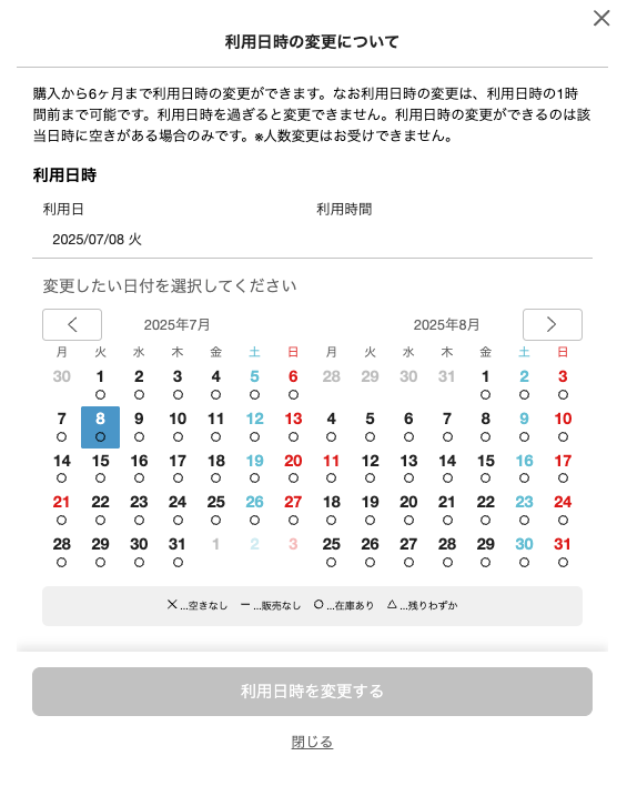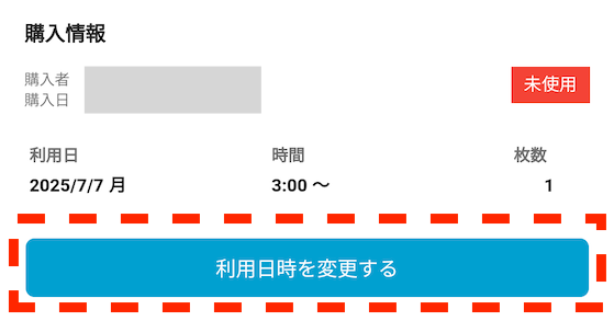 また予約管理(おでかけ)にて「利用日時を変更する」が表示されていないチケットは変更不可となります。