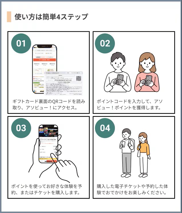 アソビュー!ポイントコードは、お客様のアカウントにアソビュー!のポイントをチャージしてご利用いただけます。